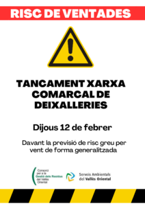 Dijous 12 de febrer la Xarxa Comarcal de Deixalleries romandrà tancada davant la previsió de risc greu per vent de forma generalitzada.